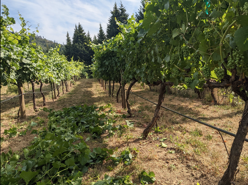 Thinning: Too much fruit actually may not be a good thing. Balance is key in the vineyard and the vine's limited energy is stretched too thin by too many clusters on the vine, the end result won't be favorable. So the remedy is to thin (also known as dropping fruit). Another aspect of thinning is to get rid of any suckers and water shoots that didn't bloom any fruit.