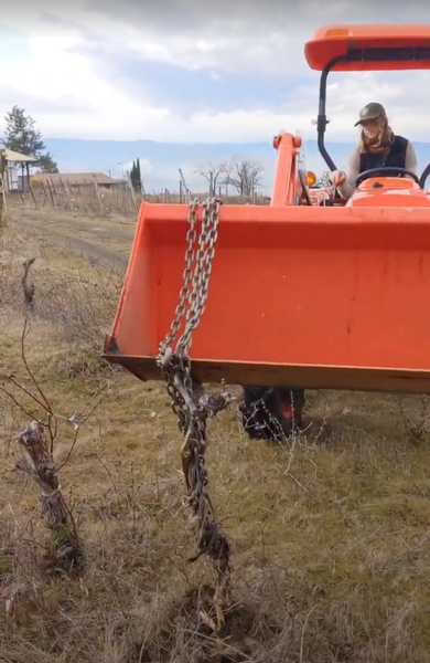 Winter vines are dormant, free of shoots, leaves and fruit. Thus, it’s a great time to make decisions about propagating, removing, or planting new vines. In one of the vineyards, we removed a few acres of vines that were malnourished or dead. This was accomplished by securing one end of a metal chain to the base of the vine and the other, to the bucket of a tractor. Then, liftoff!